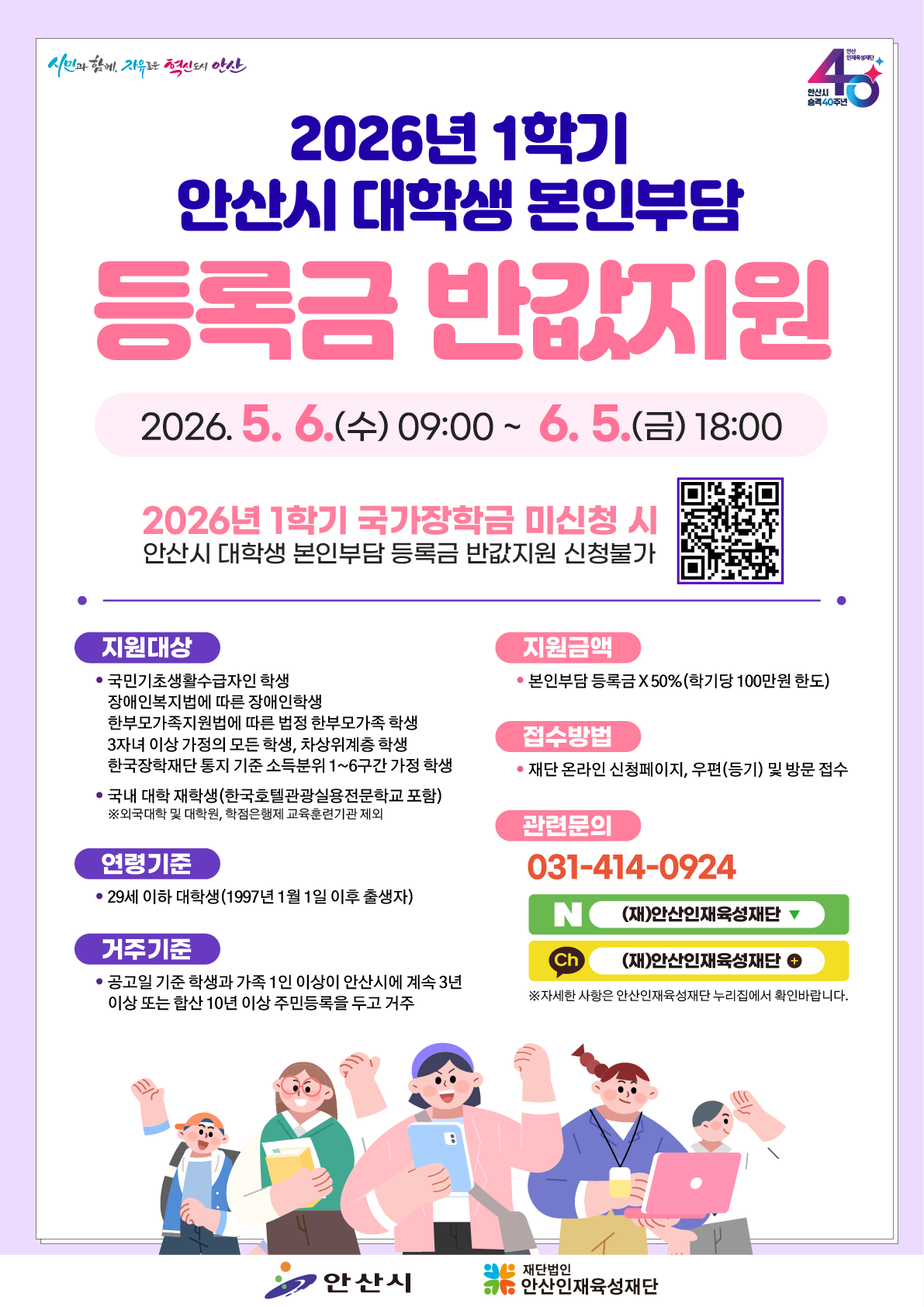 경기 안산시가 대학생의 교육비 부담을 덜기 위한 등록금 지원 사업 신청을 받는다. 안산인재육성재단은 오는 5월6일부터 6월5일까지 ‘2026년도 1학기 대학생 본인부담 등록금 반값지원’ 신청을 접수한다고 6일 밝혔다. 이번 사업은 청년들의 학업 여건을 개선하고 교육 기회 형평성을 높이기 위해 추진된다. 지원 대상은 국민기초생활수급자와 장애인, 3자녀 이상 가정 학생, 차상위계층, 법정 한부모가정, 한국장학재단 기준 소득분위 1~6구간에 해당하는 29세 이하 대학생이다. 신청 자격은 공고일 기준 학생 본인과 가구원 1명 이상이 안산시에 3년 이상 계속 거주했거나, 합산 10년 이상 주민등록을 두고 거주한 경우에 해당한다. 또한 해당 학기 대학에 재학 중이어야 한다. 접수는 안산인재육성재단 누리집을 통한 온라인 신청과 방문, 등기우편 방식으로 가능하다. 재단은 서류 간소화가 이뤄진 만큼 변경된 제출 서식을 확인해 접수해야 한다고 안내했다. 이민근 안산시장은 “안산의 미래를 책임질 청년들이 경제적 여건에 구애받지 않고 학업에 전념할 수 있는 환경을 만드는 것이 시의 역할”이라며, “이번 반값 등록금 지원 사업이 청년들에게는 실질적인 응원이 되고, 가계에는 든든한 버팀목이 되길 기대한다”고 말했다. 출처 : 신아일보(https://www.shinailbo.co.kr)