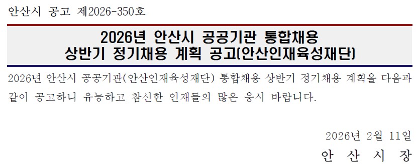 2026년 안산시 공공기관 통합채용 상반기 정기채용 계획 공고(안산인재육성재단)